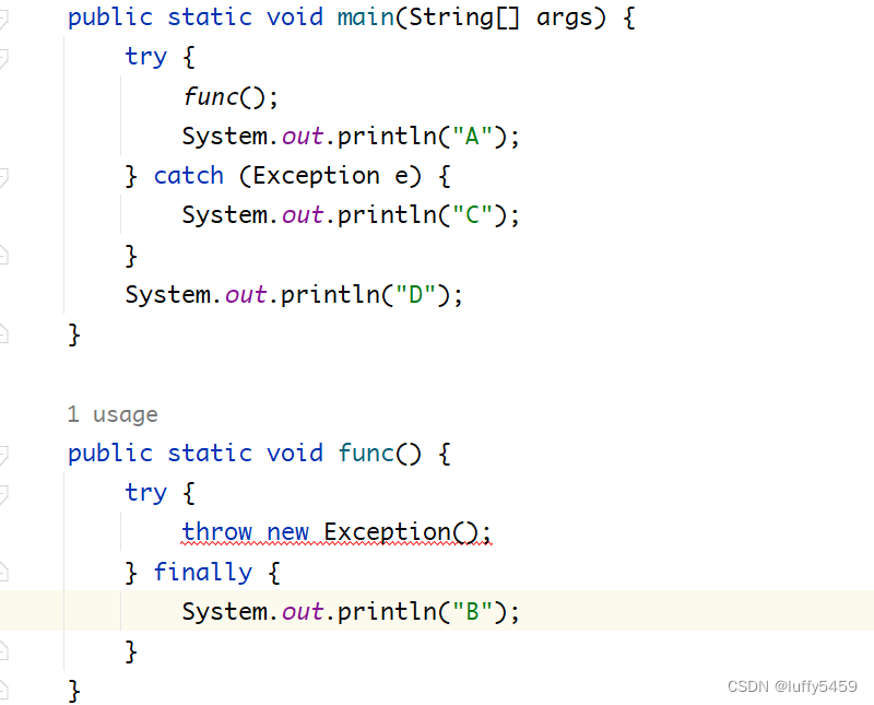这里需要在func方法签名上声明抛出异常。方法签名上添加了抛出异常,这里就编译成功,运行结果是B C D。