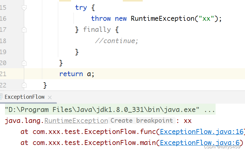 这里结果有些出人意料,并没有打印异常信息,其实就是try finally遇到了continue,导致异常信息丢失。如果这里,我们稍微改变一下,把finally中的continue注释,再来看看结果:
