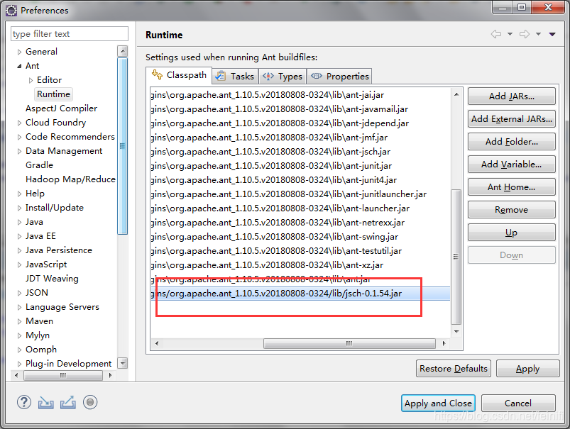 引入了这个文件,我们还需要在eclipse上做个配置,Preferences->Ant->Runtime->Classpath->Ant Home Entries,点击右侧Add External JARs,将刚才的jsch-0.1.54.jar包加入: