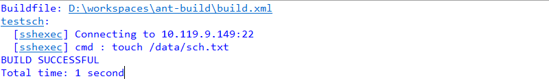 至此,我们就配置好了ant+ssh相关的配置,直接修改build.xml文件,增加一个sshexec的任务,在服务器上,执行touch 命令创建一个文件。