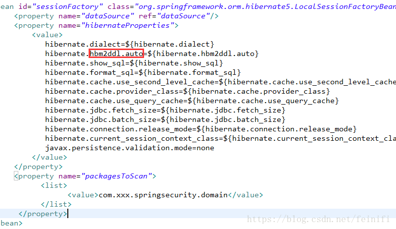 其中,关系到自动建表的关键语句在hibernate.hbm2ddl.auto属性上,另外,还需要配置packagesToScan,告诉hibernate去哪里找实体来生成表。