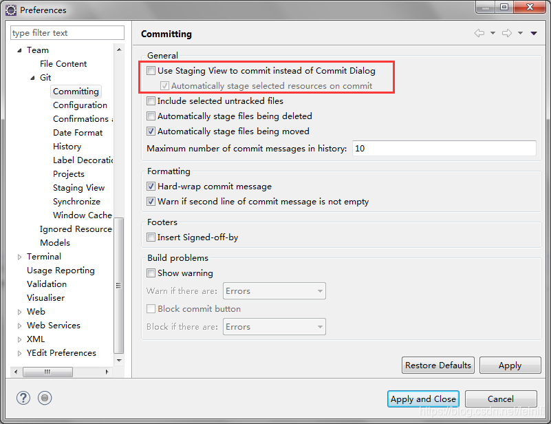 Window->Preferences->Team->Git->Committing:取消左侧第一个选项,采用工作台视图方式提交取代弹框提交。如下图所示: