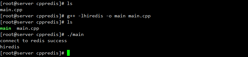 [root@server cppredis]# g++ -lhiredis -o main main.cpp