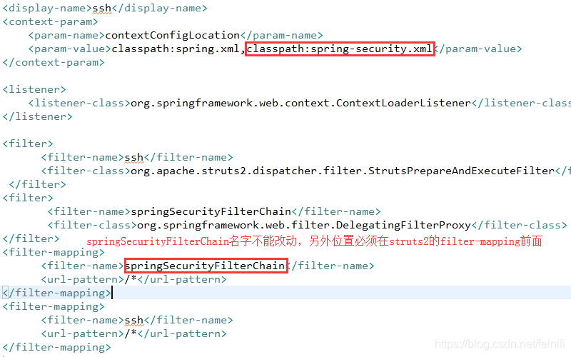 - springSecurityFilterChain这个过滤器的filter-mapping映射配置一定要配置在struts2的filter-mapping之前。
