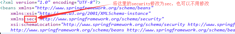 在spring-security.xml配置文件中,我们修改security这个命令空间为sec,然后配置内容如下:
