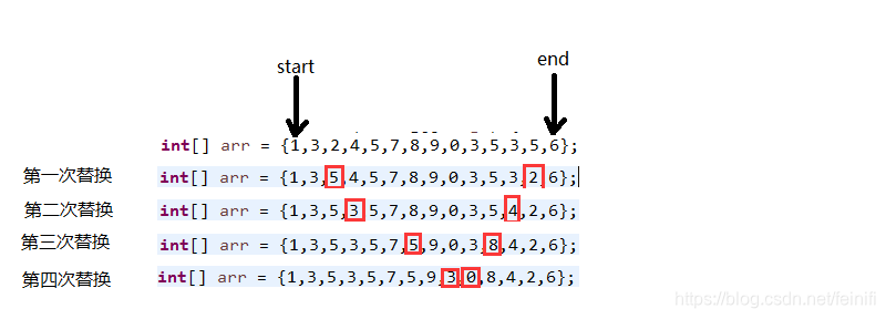 解题思路是:维护两个指针,一个指向数组第一个元素start,另一个指向数组最后一个元素end,分别相向移动两个指针,当start++指针指向偶数,end--指针指向奇数,并且start<end条件,将他们位置上的数据交换,直到start和end指针产生碰撞,即start>=end结束。