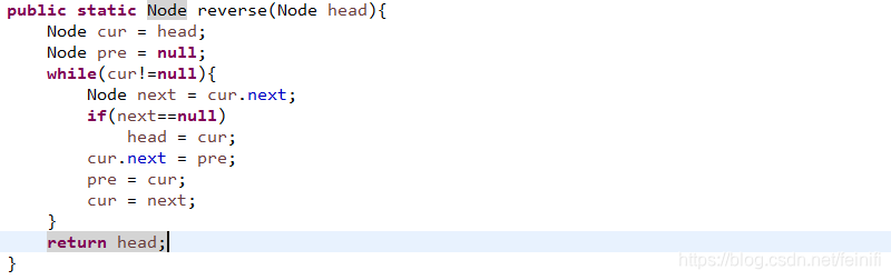 反转链表是一个很常见的面试题,一般来说,可以借助栈做反转,利用栈先进后出的特点,反转很容易理解,今天要介绍的是剑指Offer名企面试上的一种做法。这种做法是使用两个指针pre,cur,两者相差1个节点的位置,当我们遍历的时候,就把原来next的关系给调转一下,cur.next=pre。这样当链表头部遍历到尾部的时候,新的链表就诞生了,而且链表的关系也切换了。主要的代码如下:
