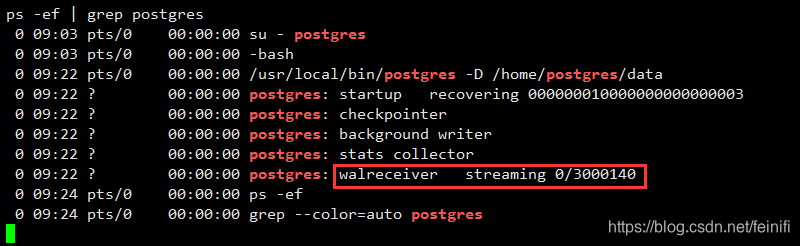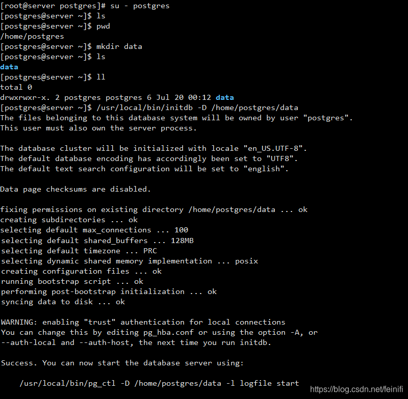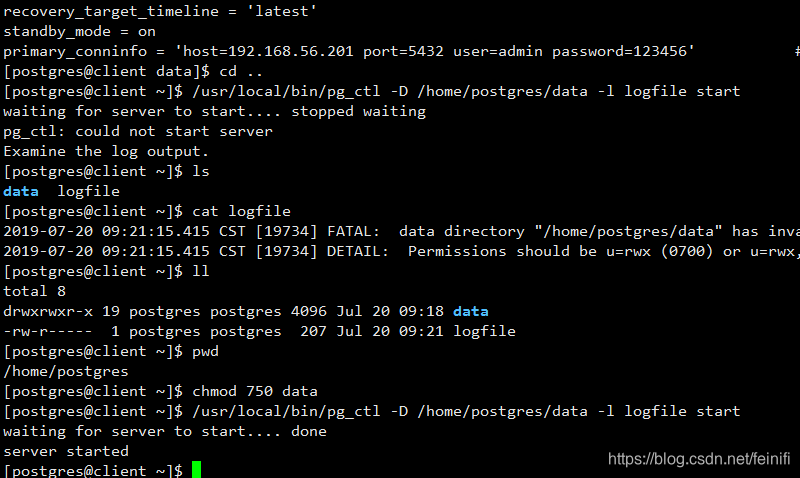 下面就是配置和启动从库了,前面注意事项里面提到,不能初始化从库,因为我们需要首先从主库备份数据,备份之后,从库的/home/postgres/data里面的数据和配置信息就和主库一致了。