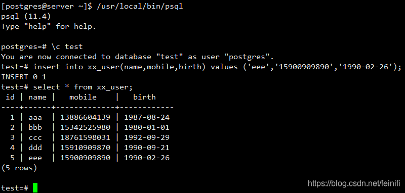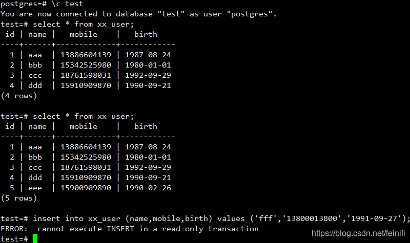 主库在首次启动的时候,没有做主从配置之前,就插入了4条记录在test数据库xx_user表中。如今再次插入一条数据,也显示成功,查询会显示5条记录。