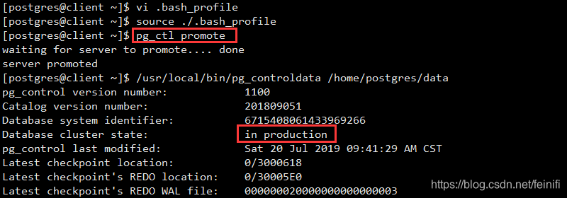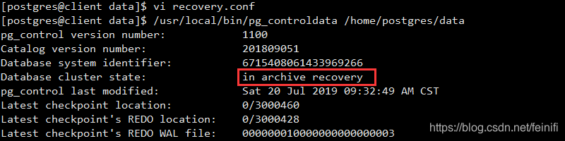 3、这里可以从/usr/local/bin/pg_controldata /home/postgres/data命令的结果状态中可以验证,主从关系,主库的集群状态是in production,从库是in archive recovery,当我们的主库崩溃,我们可以切换从库为主库。这时候主库状态是shut down,而从库是in production。这里我们模拟停掉主库。