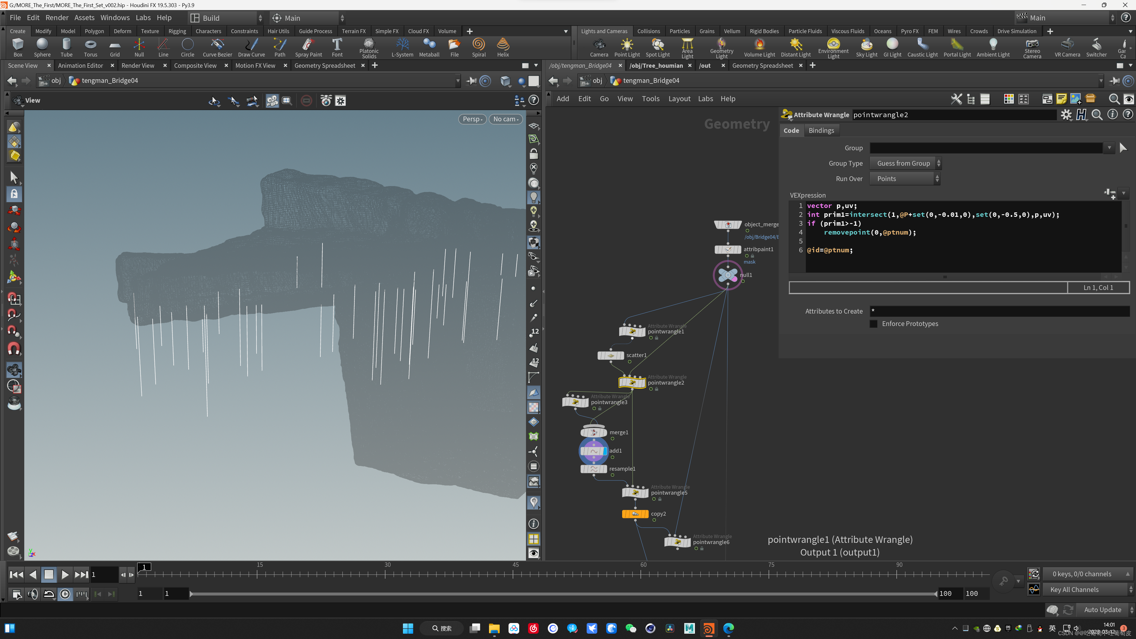 然后使用scatter在选出的面上进行撒点;这里可以在wrangle之前使用attributepaint节点绘制出想要的部分,类似于ue中的刷草操作,得到的mask属性给到scatter,实现对生成点的位置的控制;