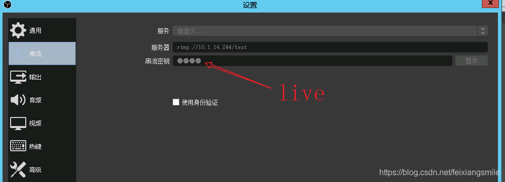 推流我们可以使用OBS studio开源软件,服务器配置为rtmp://10.1.14.244/test,串流秘钥是live,其中10.1.14.244为SRS部署的服务器ip地址,test和live都可以自己随便命名,这些在拉流(也就是直播播放时)时会用到