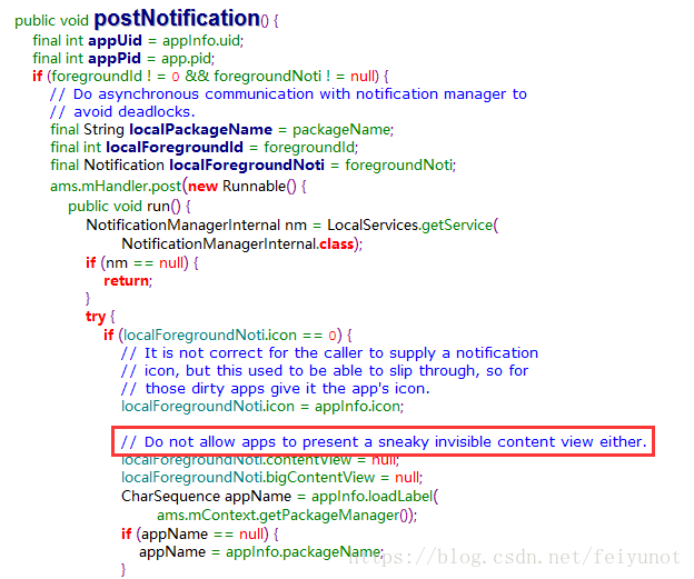 其实Google察觉到了此漏洞的存在,并逐步进行封堵。这就是为什么这种保活方式分 API >= 18 和 API < 18 两种情况,从Android5.0的ServiceRecord类的postNotification函数源代码中可以看到这样的一行注释