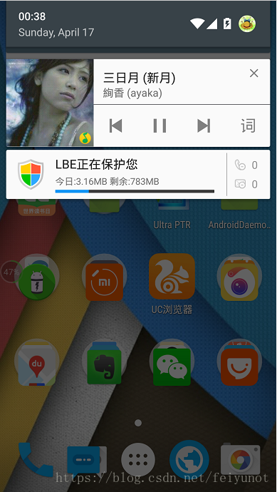 白色保活手段非常简单,就是调用系统api启动一个前台的Service进程,这样会在系统的通知栏生成一个Notification,用来让用户知道有这样一个app在运行着,哪怕当前的app退到了后台。如下方的LBE和QQ音乐这样: