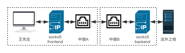 王先生的请求先后通过中继A、中继B、socks5代理,才能到达法外之地,整个链路总共需要建立 4 次 TCP 连接。
