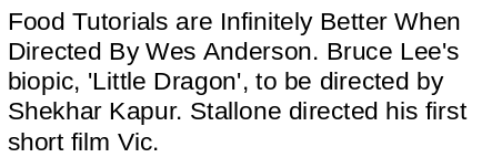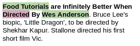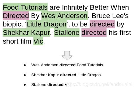 在第一句话中,我们有两个实体 (“Food Tutorials” 和 “Wes Anderson”),这些实体通过术语 "Directed"相关起来的,因此, (Wes Anderson, directed, Food Tutorials) 是一个三元组。同样,我们也可以从其他句子中提取关系: