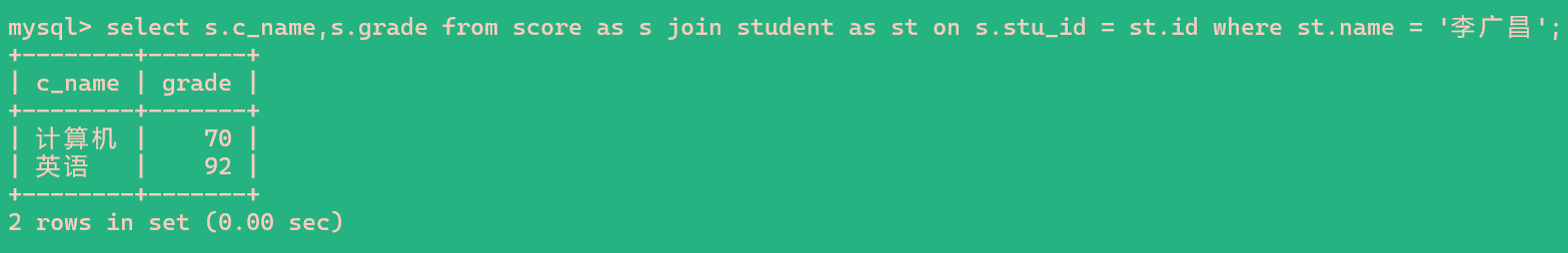 mysql> select s.c_name,s.grade from score as s join student as st on s.stu_id = st.id where st.name = '李广昌';