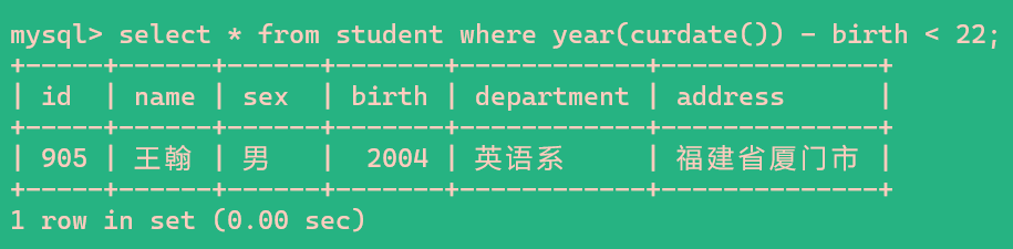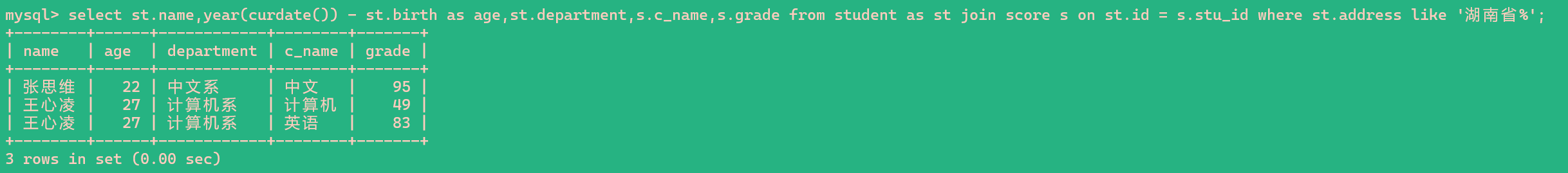 mysql> select st.name,year(curdate()) - st.birth as age,st.department,s.c_name,s.grade from student as st join score s on st.id = s.stu_id where st.address like '湖南省%';