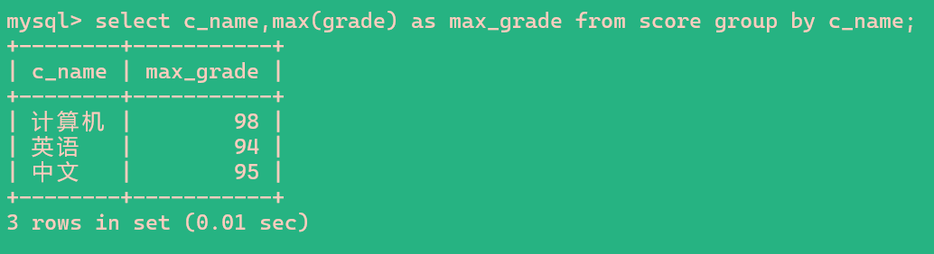 mysql> select c_name,max(grade) as max_grade from score group by c_name;