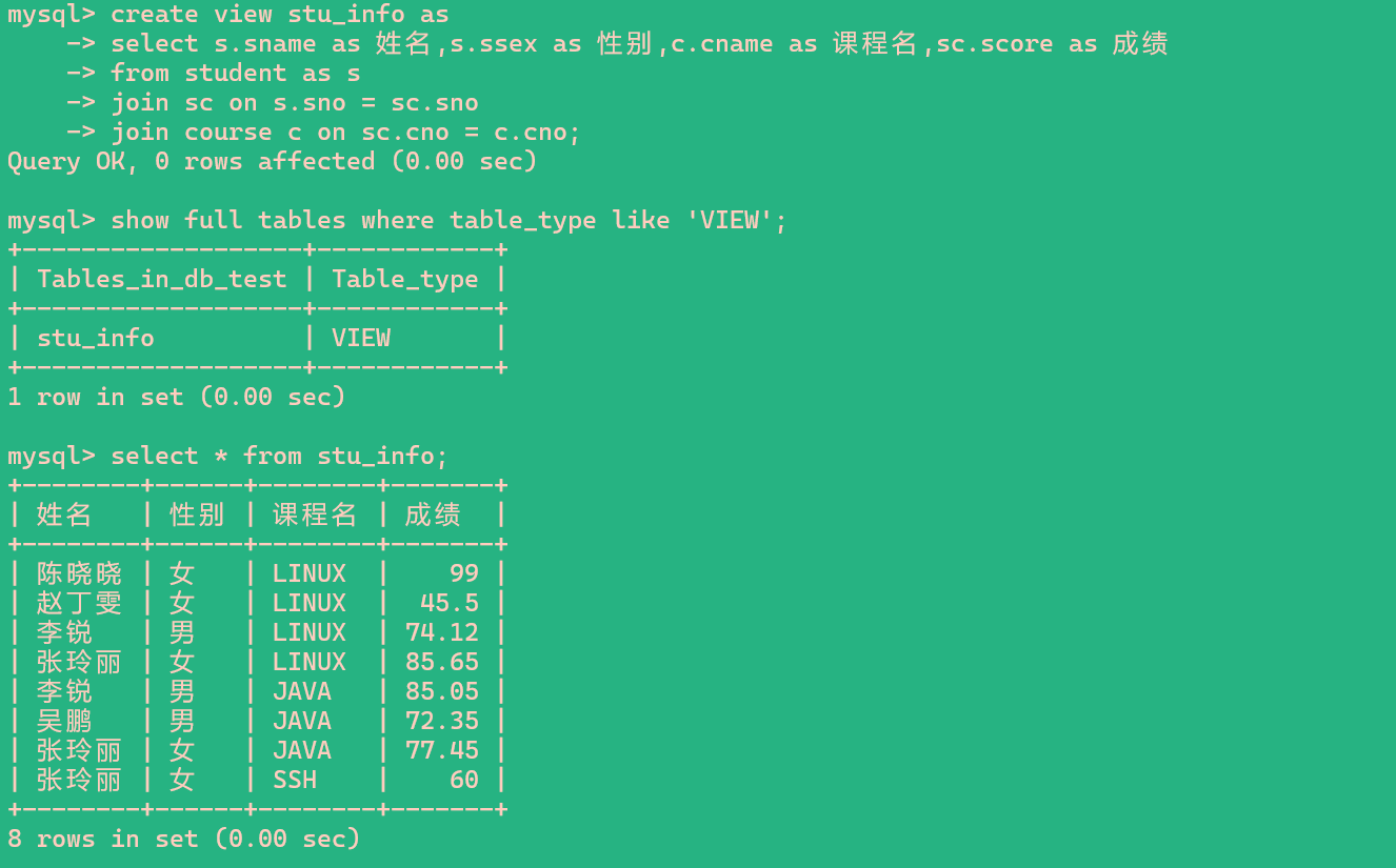2.在db_test数据库创建一视图 stu_info,查询全体学生的姓名,性别,课程名,成绩。