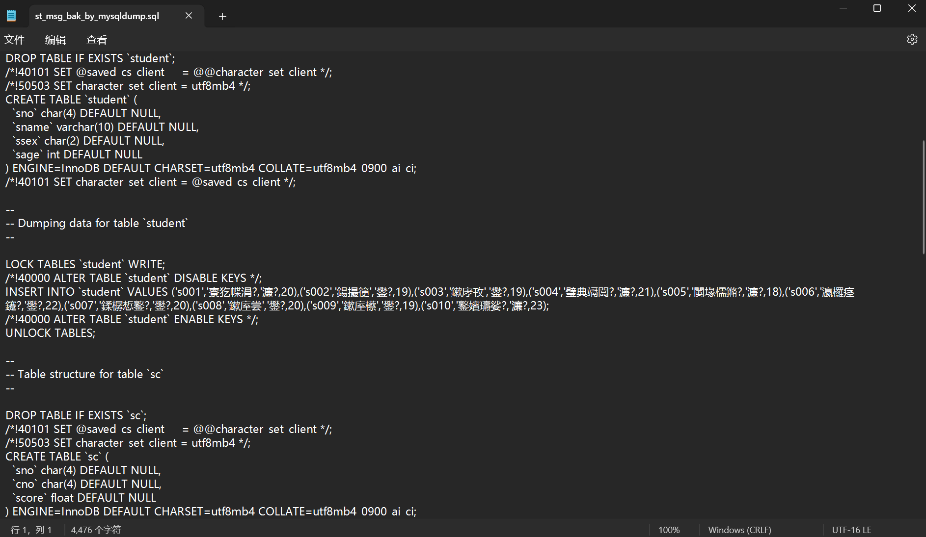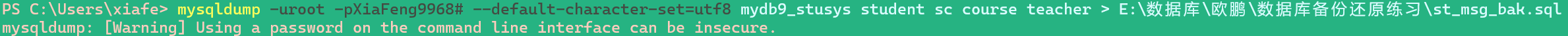 PS C:\Users\xiafe> mysqldump -uroot -pXiaFeng9968# --default-character-set=utf8mb4 mydb9_stusys student sc course teacher > E:\数据库\欧鹏\数据库备份还原练习\st_msg_bak.sql