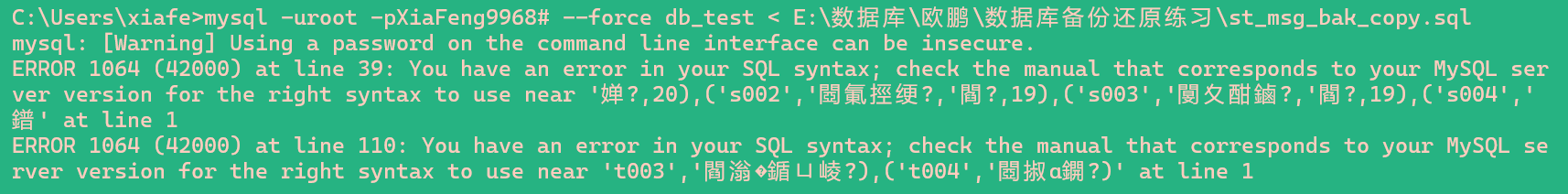 C:\Users\xiafe>mysql -uroot -pXiaFeng9968# --force db_test < E:\数据库\欧鹏\数据库备份还原练习\st_msg_bak_copy.sql