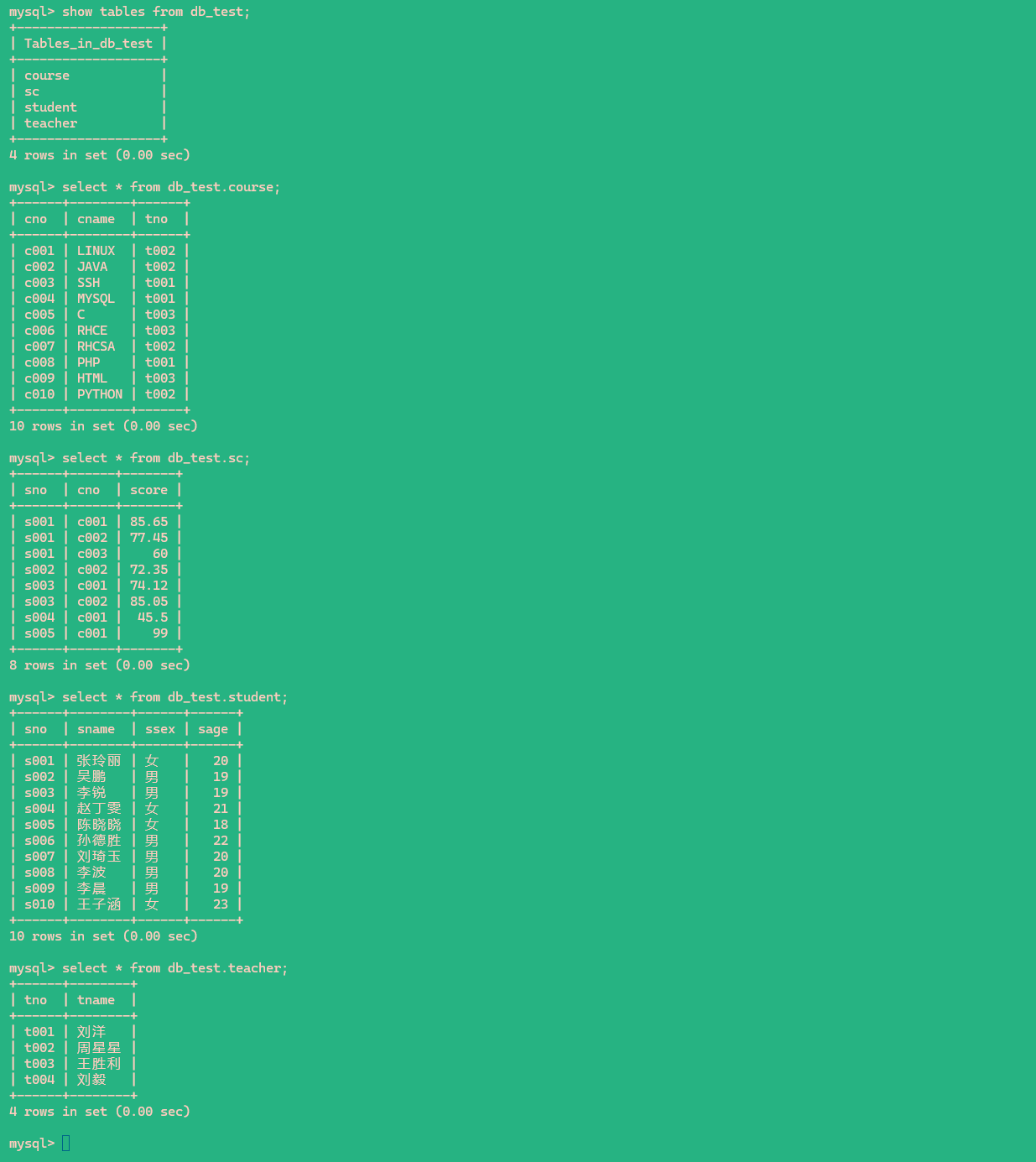 -- 1.将mydb9_stusys数据库下的student、sc 和course表,备份到本地主机保存为st_msg_bak.sql文件,然后将数据表恢复到自建的db_test数据库中;