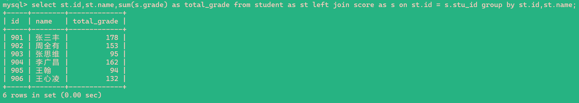 mysql> select st.id,st.name,sum(s.grade) as total_grade from student as st left join score as s on st.id = s.stu_id group by st.id,st.name;