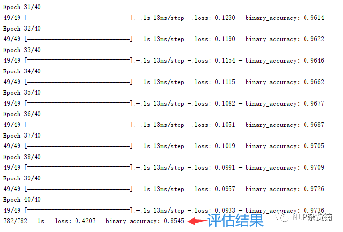 history = model.fit(train_data, train_labels, epochs=40, batch_size=512)