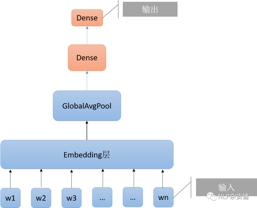 使用的模型结构如下图所示,输入接入embedding层,然后是一层全局平均池化层,再接两层全连接即输出:
