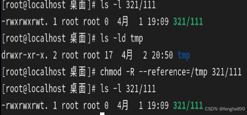chmod -R --reference=/tmp 321/111 ##复制tmp目录的权到321及目录的子文件111