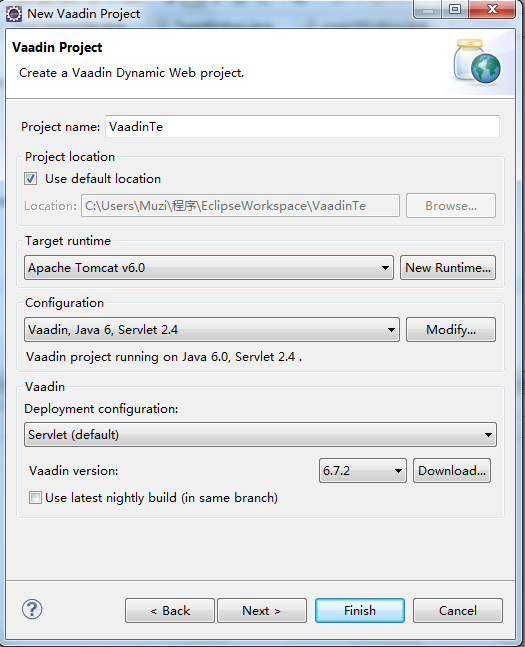 其他的用默认就好了,不过我还是忍不住在Configuration里选择了Vaadin, Java 6, Servlet 2.4。
