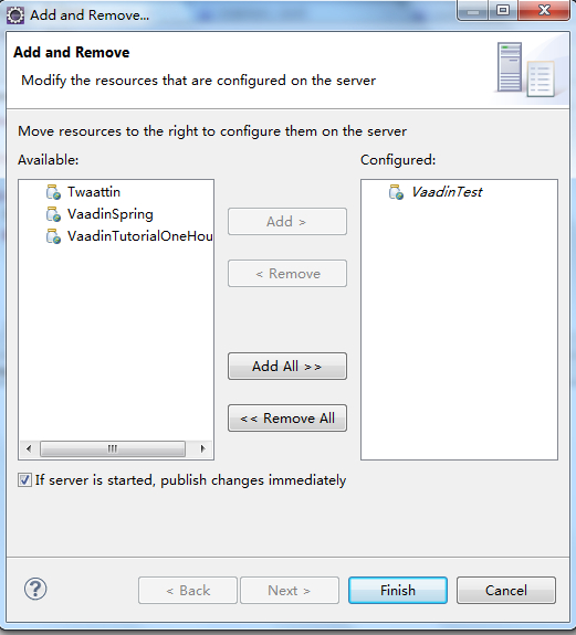 然后在左侧选择要部署的项目,再点Add,把它加到右边去。选好后,点Finish结束。
