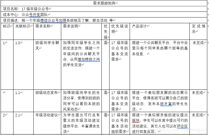 一、 你联合同学做一个年级微信公众号加强各班相互了解、联合活动 等。请写一份两页的报告,描述收集需求的方法,并附上收集的 需求跟踪矩阵(不少于五个需求)