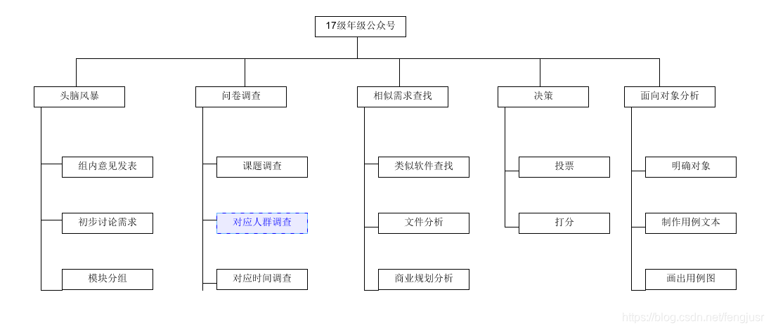 头脑风暴:召集项目所有的参与成员,共同讨论关于微信公众号对于加强各班之间交流的需求,总结目前存在的各班的问题,找到当前各个平台提供的一系列功能中的痛点,每个人依次提出五点关于自己觉得比较重要或是紧要的需求,并说明在微信公众号这个平台上能如何实现以及实现方式,可以接受提到的重复的需求,并对这些需求进行汇总,最终进行投票,对这些需求的优先级进行排序。