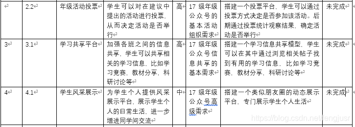 访谈与焦点小组:可以联系参与过制作类似的公众号或小程序的同学进行咨询,并听取他们的意见,以了解在实际完成过程中会遇到的一些实际需求,并可以了解一下他们是否有由于各种原因无法完成的需求,并记录这些需求未完成的原因,最终与本项目组成员提出的需求进行对比,以找出不可取的需求和完成难度太大的需求,根据需求程度和完成难度进行汇总,最终得到各个需求的优先完成级别。