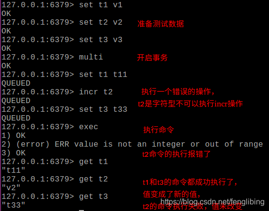 可以看到即使开了事务,事务中正确的命令也得到了执行,不正确的命令没有被执行,谁出错谁负责。