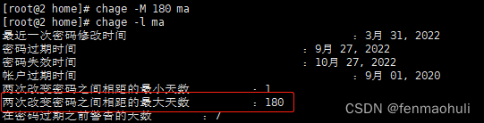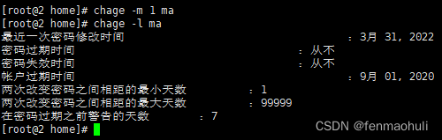 -m mindays 最小天数 将两次改变密码之问相距的最小天数设为"最小天数”