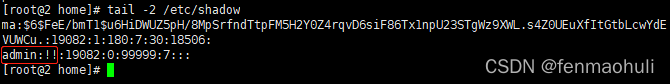 第二列:存放真正加密的密码,采用SHA512散列算法,更加安全加密 原来用MD5或DES!!和*表示没有密码不能登陆,新创建用户也是!!,如果密码前面显示双感叹号表示该账户被锁定了。