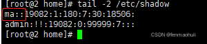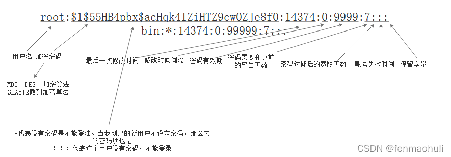 和/etc/passwd 文件一样,文件中每行代表-一个用户,同样使用":"作为分隔符,不同之处在于,每行用户信息被划分为9个字段。