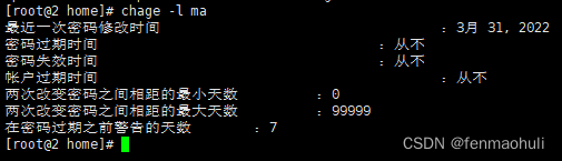 第六列:密码到期前的第几天发出告警信息,默认是7天,每次登录系统都会向该账户发出"修改密码”的警告信息。