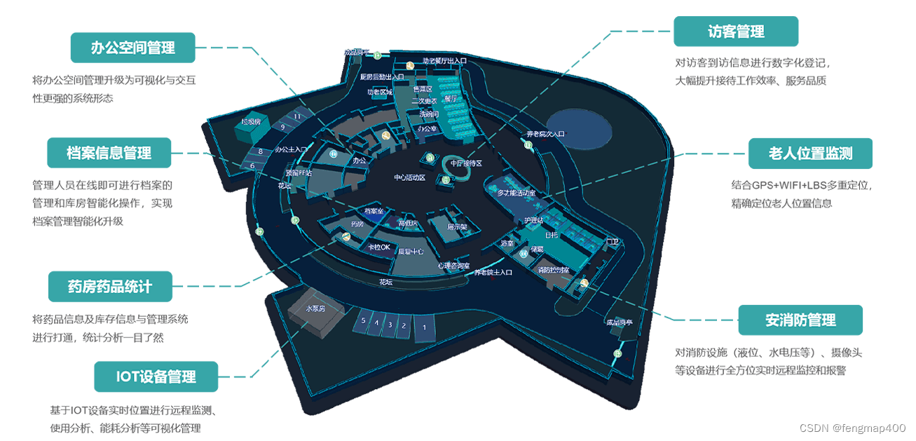 通过“一张图”,将办公空间管理、访客管理、档案信息管理、老人位置监测、IOT设备管理等功能模块进行可视化呈现,有效提升养老空间的管理效力及服务水平。