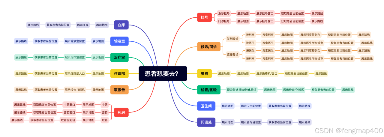 为了更好地满足患者的需求,小蜂的院内定位导航系统提供了一整套基于患者就医流程的服务。系统将就医流程分为以下几大部分,每个部分都为患者提供了直观、精准的引导: