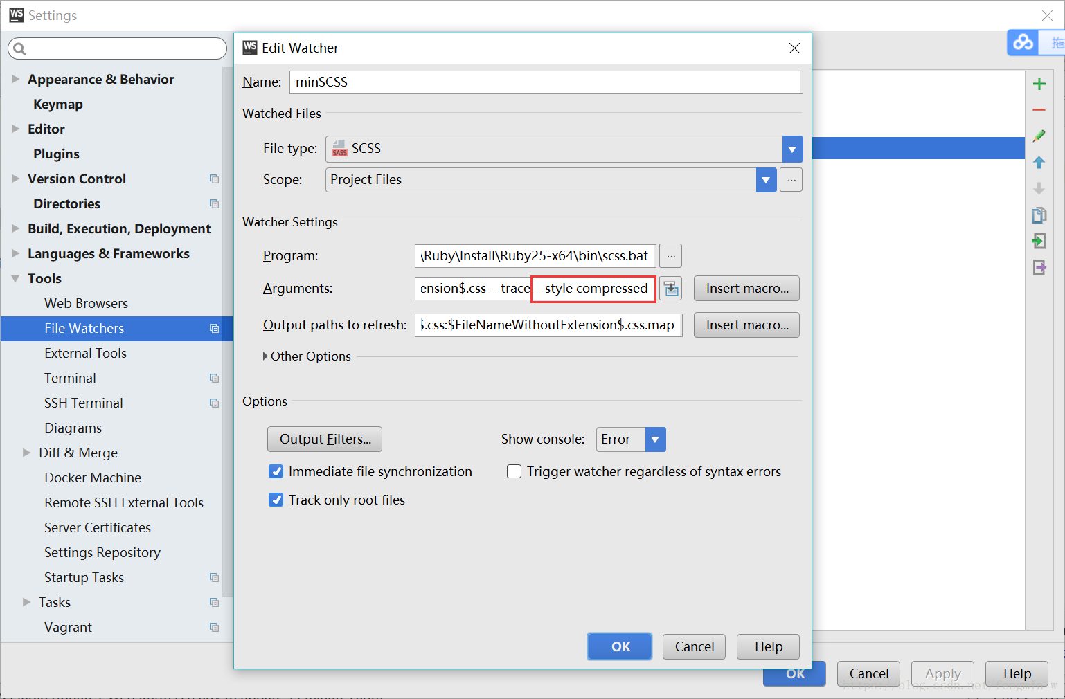 注意:$FileName$后面有个冒号。 $FileParentDir$ 表示scss/sass文件所在的文件夹的父级文件夹,而不是scss/sass的父文件夹