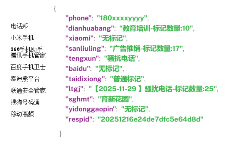 API接口查询是企业风控系统的"神经末梢",能够实现毫秒级的号码标记识别。当用户提交手机号进行注册、登录或交易时,系统通过API接口实时调用标记查询服务,瞬间获取该号码的标记状态。