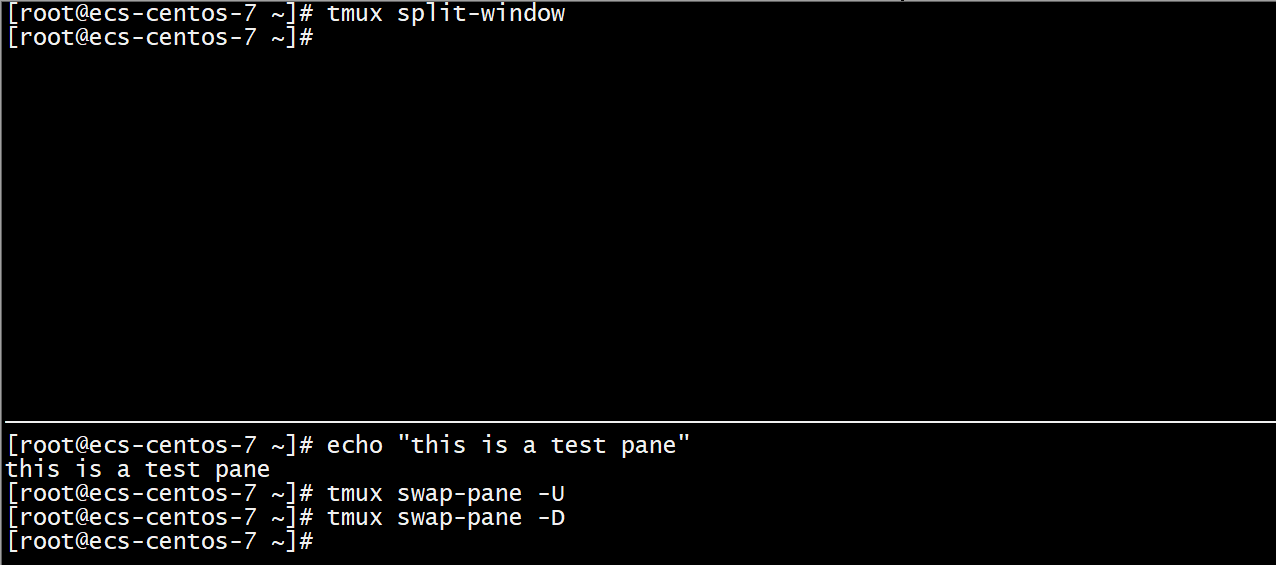 上面的例子中,先输入 tmux split-window 命令把窗口划分成上下两个窗格,鼠标光标在下面的窗格中,为了交换窗格操作前后的数据对比,在下面的窗格输出一个测试字符串