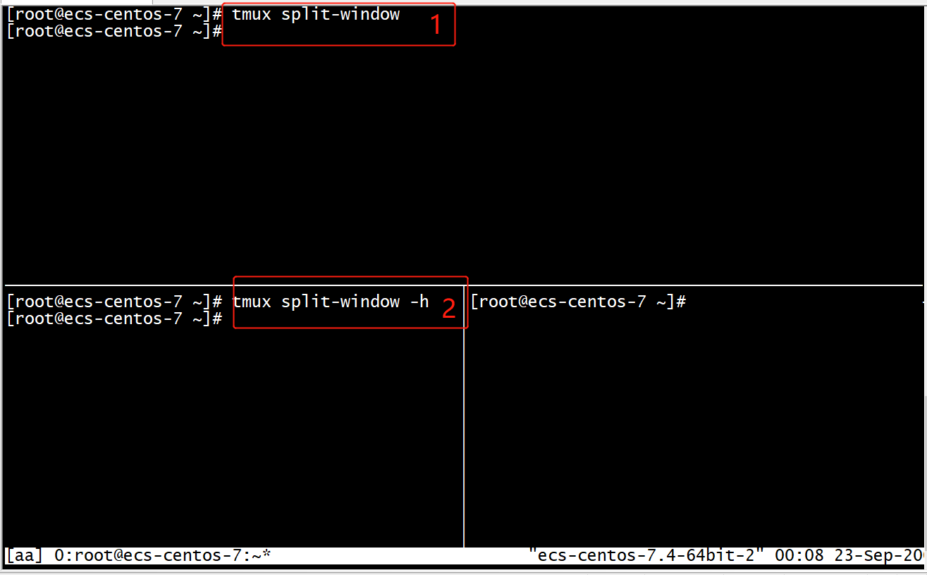 [root@ecs-centos-7 ~]#上面的例子中,输入 tmux detach 命令之后tmux窗口从名字为 aa 的会话中分离出来了