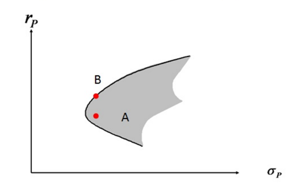 A和B有相同的x值,表示具有相同的风险。B点在A点上面,表示B的收益率高于A。对于理性的投资者来说,如果只在A点和B点之间做投资选择,那么大家都会投资到B点,而不投资于A点。