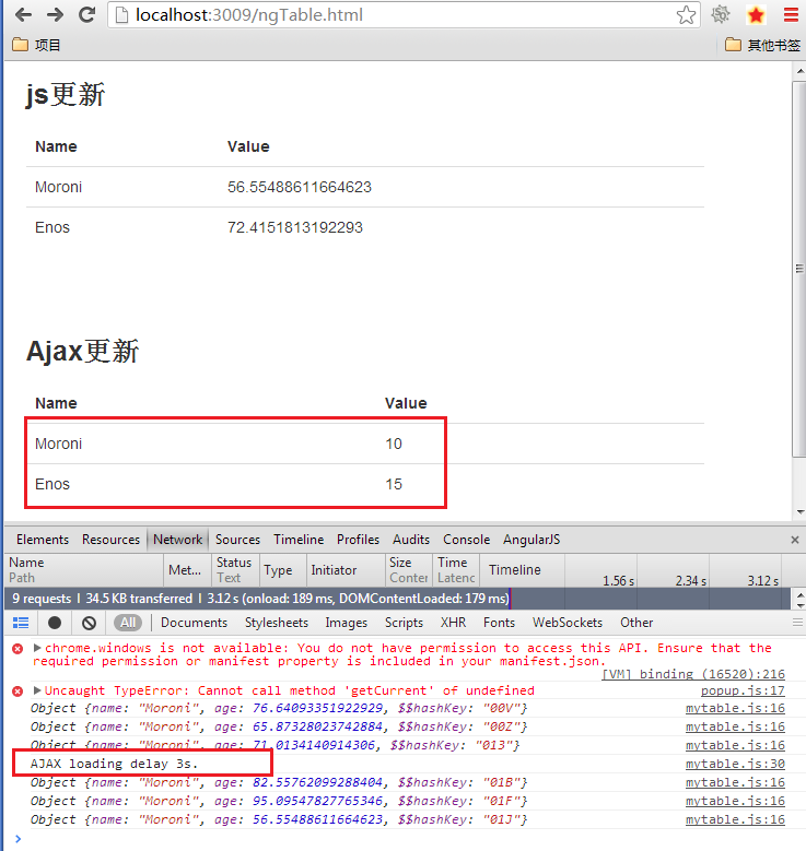 通过Ajax,等待3秒后,实现对ngTable的更新。