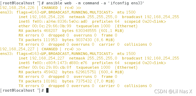 ansible web -m command -a 'ifconfig ens33'